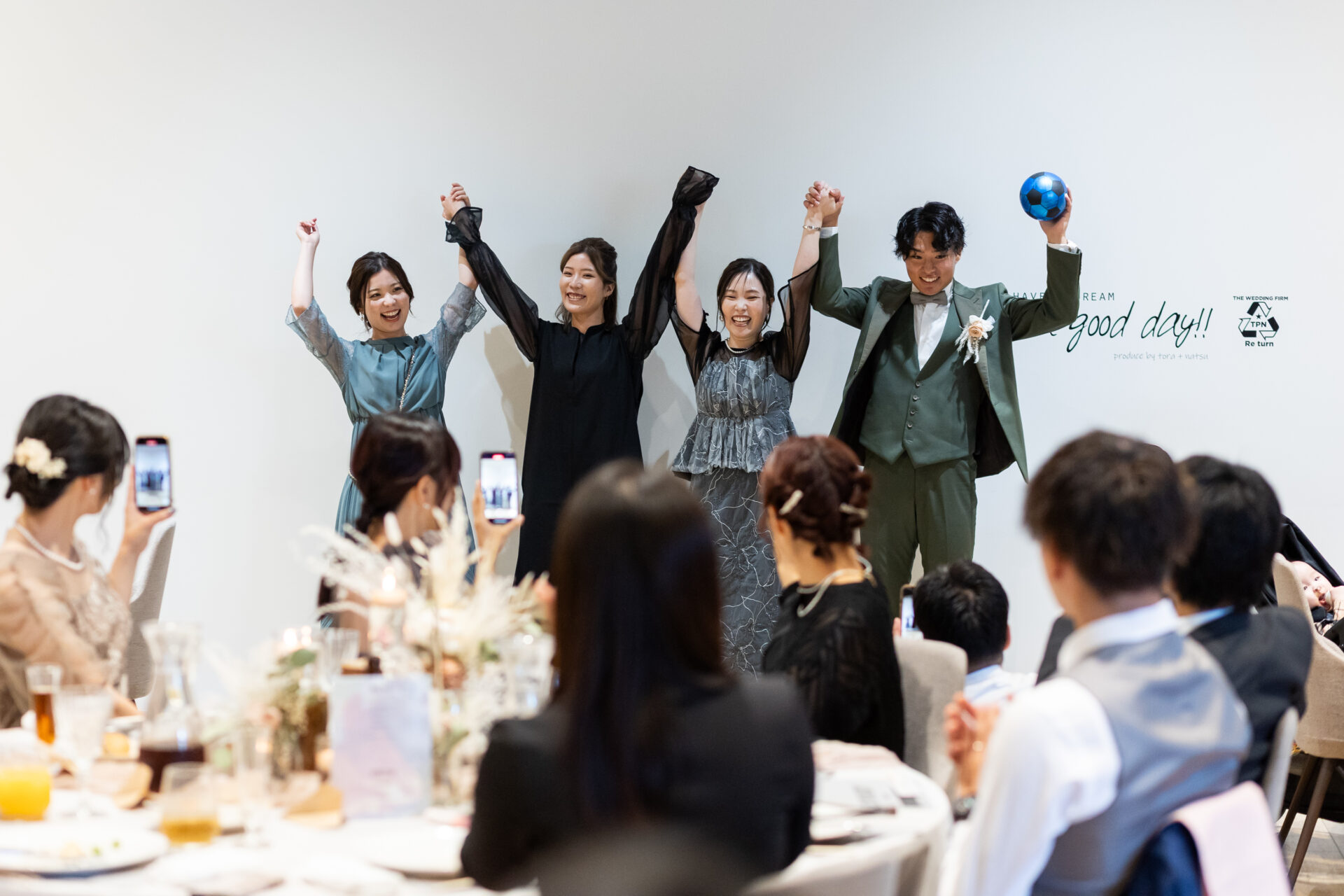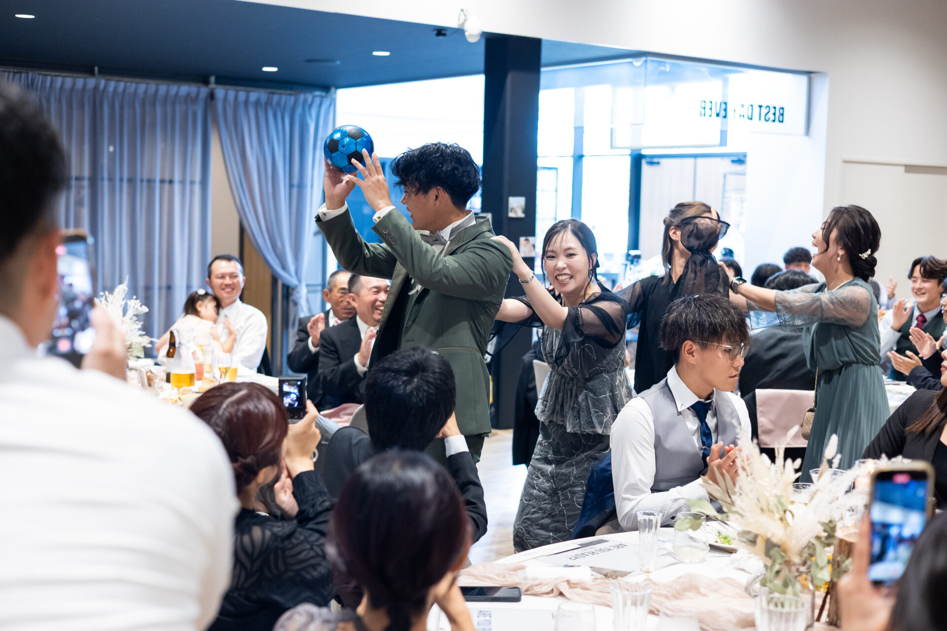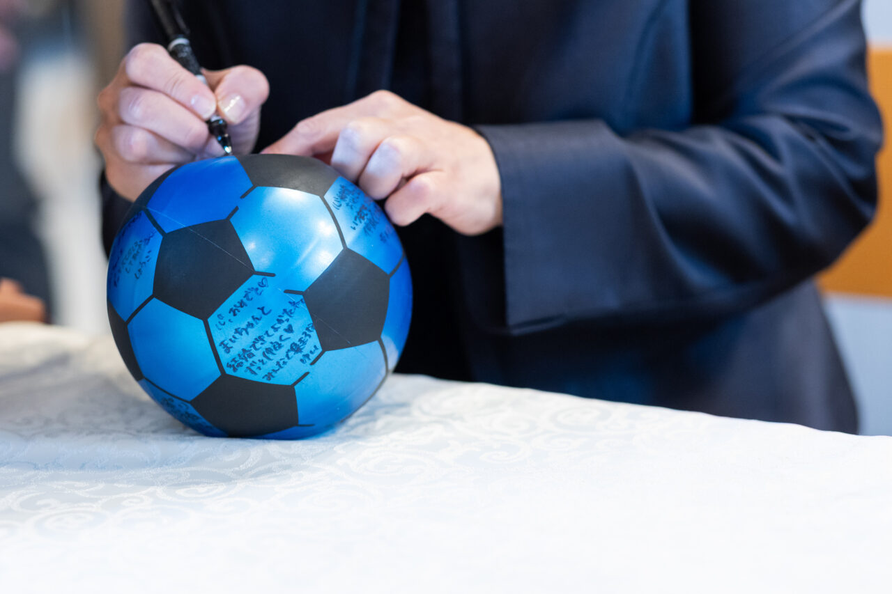 新郎中座で、ゲストからの寄せ書き入りサッカーボールのサプライズがあったり、